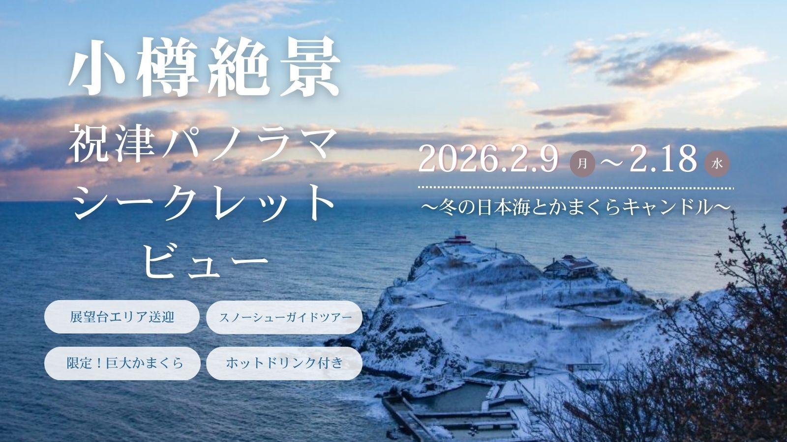 おたる水族館第一駐車場付近でイベント参加受付を行い、ガイド同行によるスノーシューツアーを実施いたします。普段は足を踏み入れることのできないコースをスノーシューで歩き、冬の祝津の幻想的な風景をお楽しみいただきながら展望台まで向かっていただき、展望台到着後には、設置しているかまくらやお飲み物等をお楽しみください。